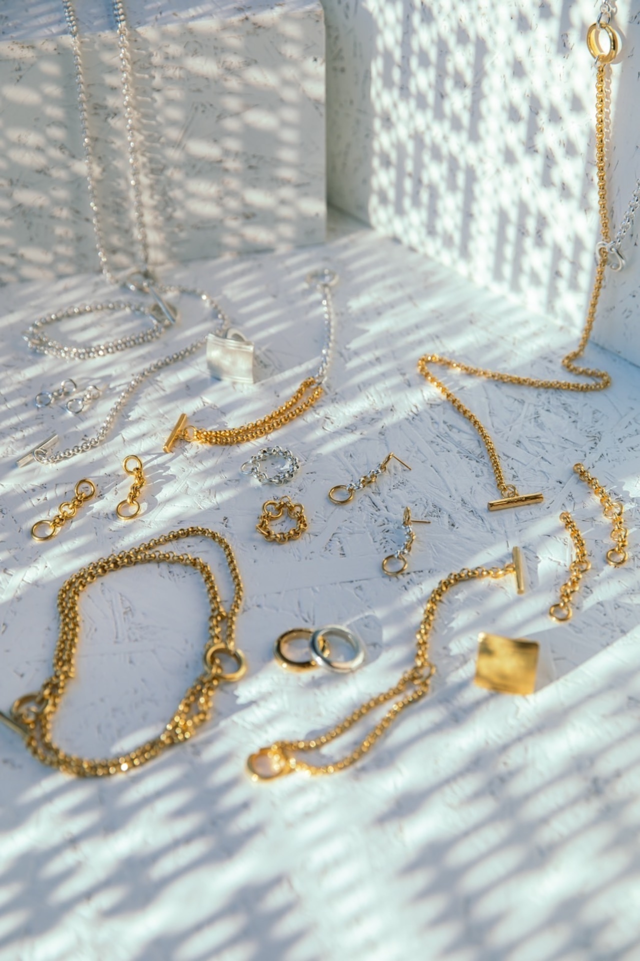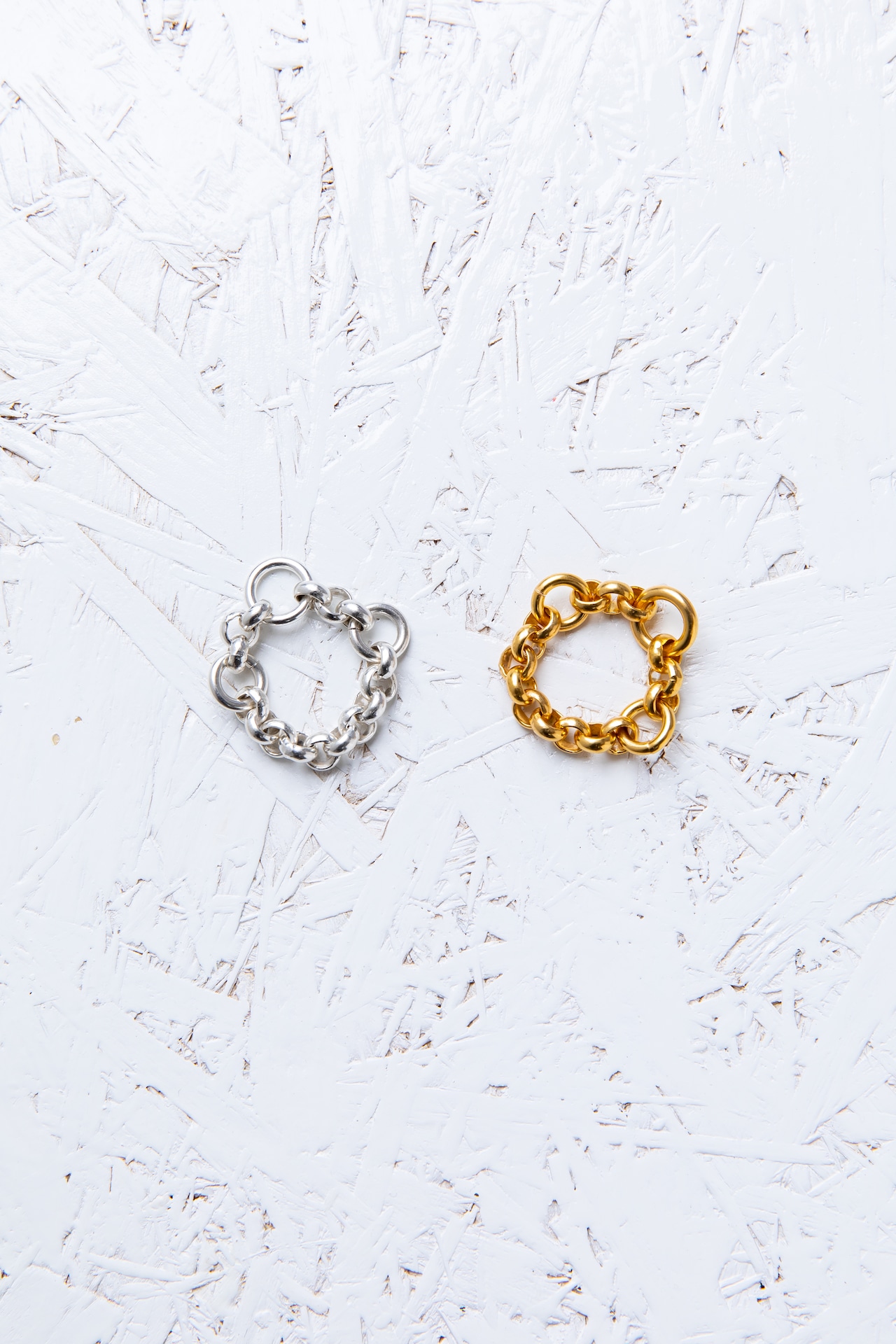 甲丸チェーンに3つの〝EN-円-マル〟マルが連なったデザイン。リングの重ねづけを、誰にでも楽しんでもらいたいと言う願いをこめて、シルバーとゴールドの2本のリングを2つセットにしました。