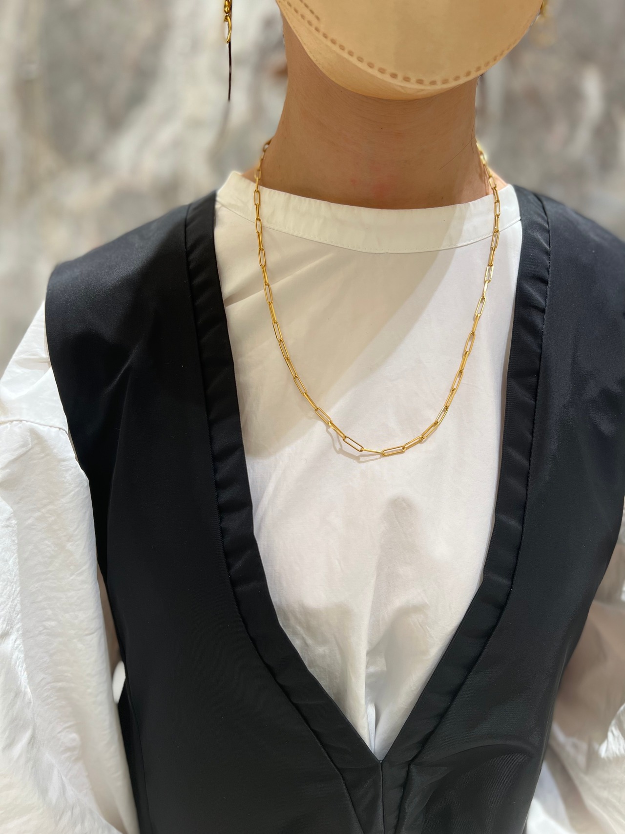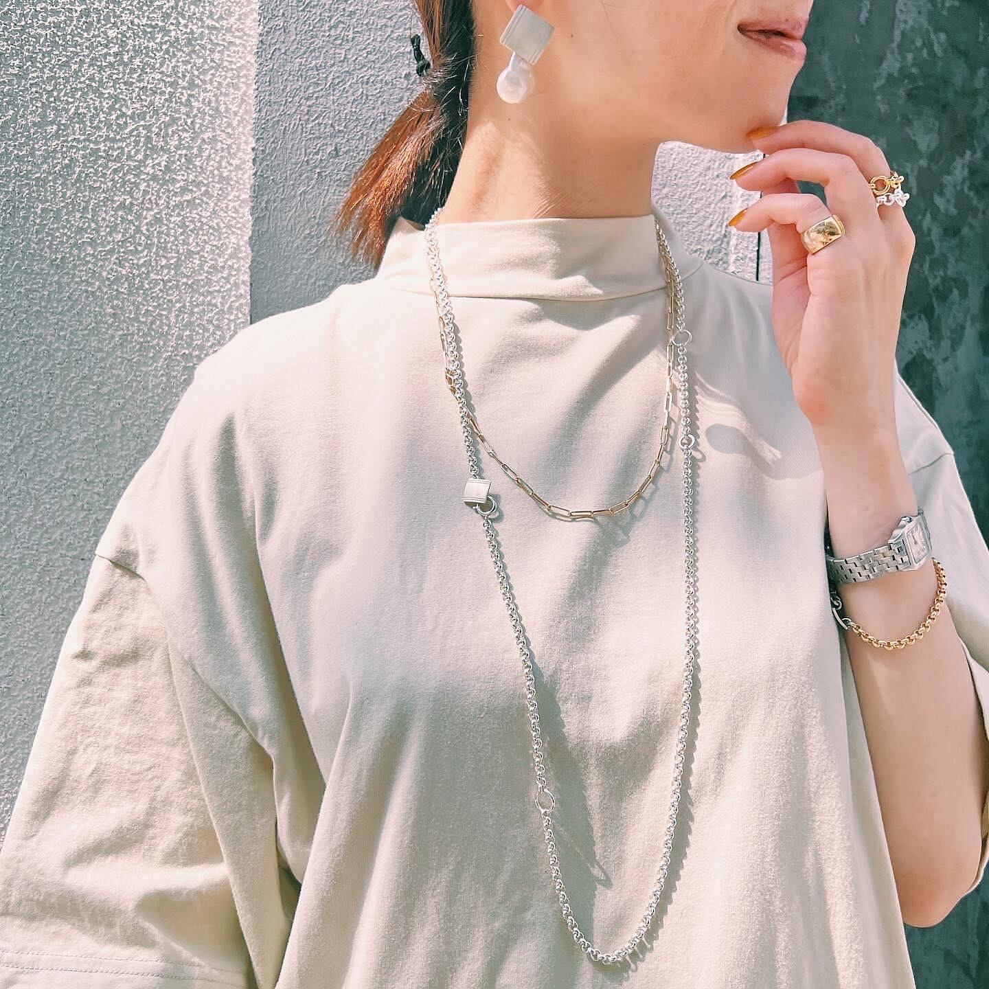 スクエアにカットされたチェーンが連なり、綺麗めで素肌に馴染む印象のネックレス。