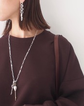 ✔︎チョーカーにもなるパールネックレスは長さが調整でき重ねづけを楽しめる。