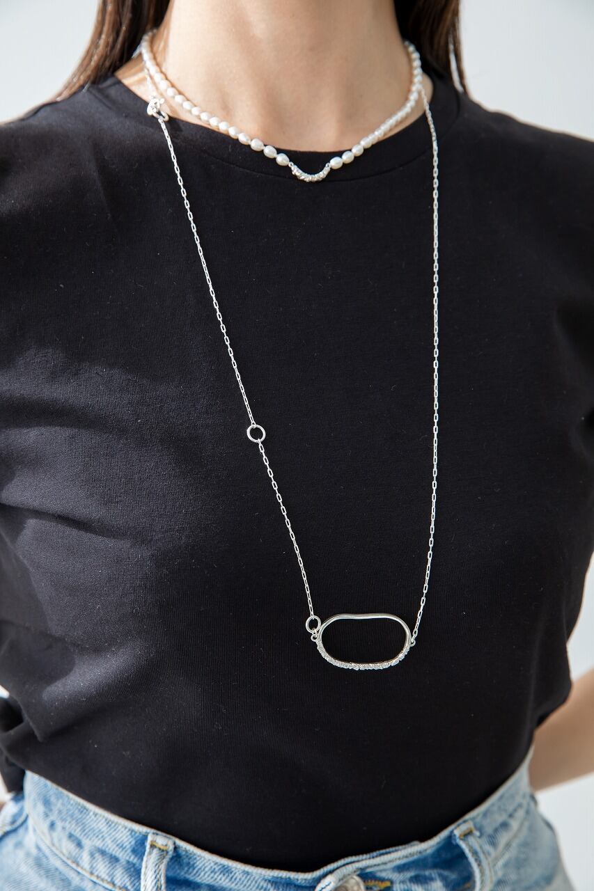 BAR&三日月MOONのPEARL PETIT NECKLACEは、月の表面の凹凸をイメージしたデザインが特徴のネックレスです。シンプルながらも個性的なデザインなので、どんなスタイルにも合わせやすく、大人の女性にぴったりのジュエリー。