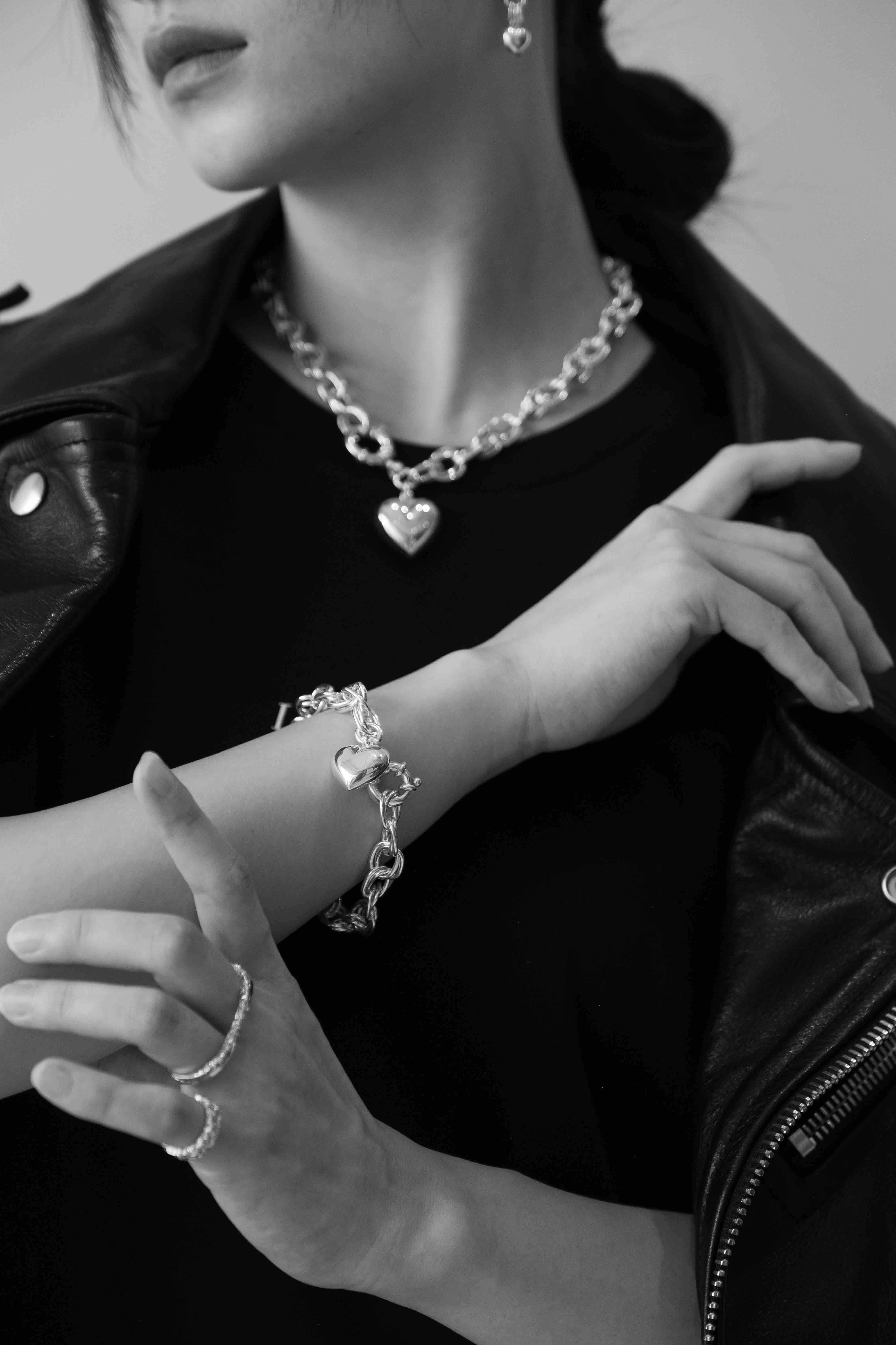 アランの2024AWコレクション!魅力あふれるハートWリングチェーンブレスが登場。 ボリューム感がありながらも軽やかな中空チェーンが、手元を美しく演出します。ころんとしたハートのモチーフがシンプルでありながらも存在感のあるデザインで大人可愛いが叶います。