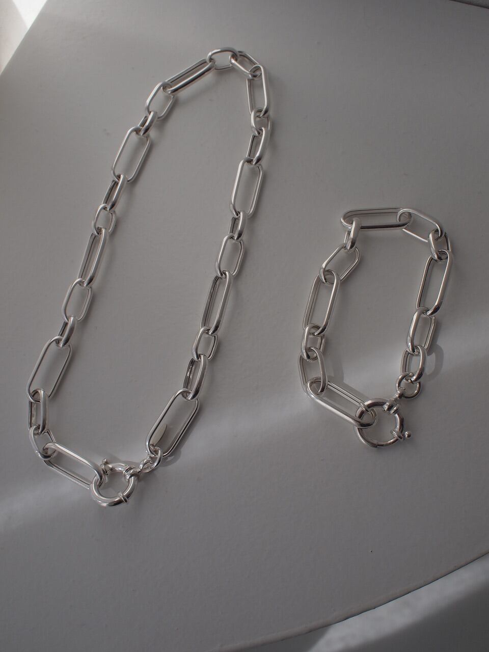 異なるデザインの3つのスクエアをランダムに組み合わせたスクエアチェーンネックレス。シルバー925でありながら、ボリュームもあり中空チェーンなので軽くてつけやすく、デイリーから特別なシーンまで幅広く活用できるアイテムです。